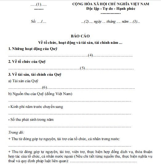 Nội dung báo cáo phản ánh đầy đủ các thông tin liên quan đến cơ cấu tổ chức, kết quả hoạt động trong kỳ, nguồn tài sản, tình hình thu – chi tài chính và việc quản lý, sử dụng quỹ. Thông qua biểu mẫu này, cơ quan quản lý nhà nước có cơ sở theo dõi, kiểm tra và đánh giá mức độ tuân thủ quy định pháp luật cũng như hiệu quả hoạt động của quỹ. Việc lập báo cáo theo đúng mẫu quy định giúp bảo đảm tính minh bạch, rõ ràng trong công tác quản lý tài chính và hoạt động của quỹ.