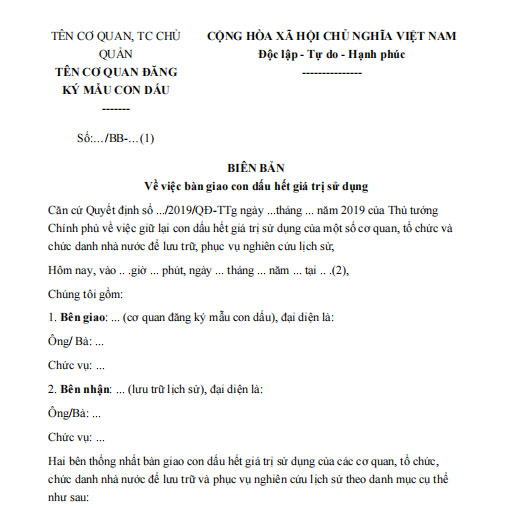 Mẫu biên bản bàn giao con dấu hết giá trị sử dụng