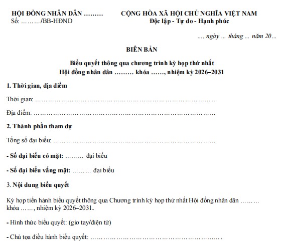 Mẫu Biên bản biểu quyết thông qua chương trình kỳ họp thứ nhất của HĐND các cấp nhiệm kỳ 2026-2031