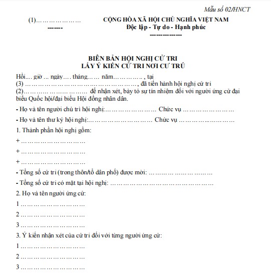 Ghi chú: Mẫu số 02/HNCT được áp dụng đối với hội nghị cử tri nơi cư trú để lấy ý kiến đối với người ứng cử đại biểu Quốc hội, đại biểu Hội đồng nhân dân (theo quy định tại Điều 45 và Điều 54 của Luật Bầu cử đại biểu Quốc hội và đại biểu Hội đồng nhân dân, bao gồm cả người được giới thiệu ứng cử và người tự ứng cử).