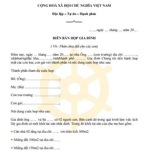 Mẫu biên bản họp gia đình là mẫu biên bản ghi chép lại nội dung cuộc họp gia đình về việc phân chia phần đất hương hỏa mà ông bà, cha mẹ để lại mà không có di chúc cụ thể cho các thành viên trong gia đình.