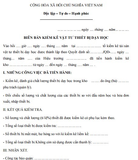 1. Mẫu biên bản kiểm kê vật tư thiết bị dạy học