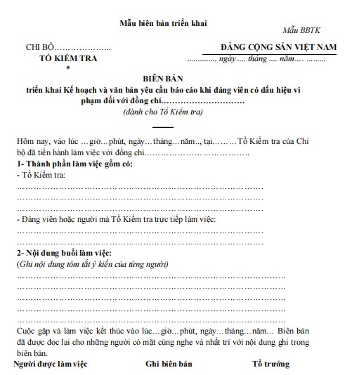 Mẫu biên bản triển khai Kế hoạch và văn bản yêu cầu báo cáo khi đảng viên có dấu hiệu vi phạm là biểu mẫu hỗ trợ Chi bộ và cấp ủy thực hiện đúng quy trình kiểm tra, giám sát theo quy định của Đảng.