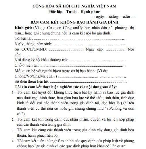 2. Biểu mẫu cam kết không bạo hành gia đình