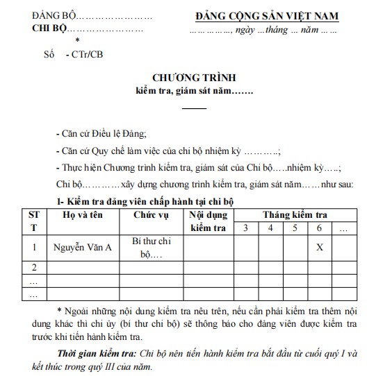 Mẫu chương trình kiểm tra giám sát của chi bộ