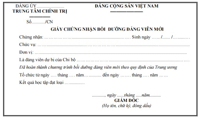 GIẤY CHỨNG NHẬN BỒI DƯỠNG ĐẢNG VIÊN MỚI