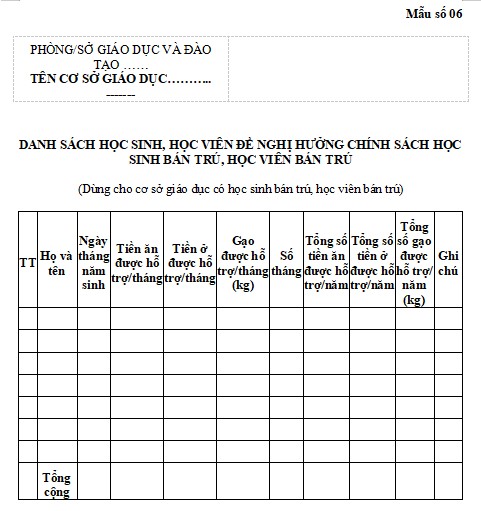 Mẫu danh sách học sinh, học viên đề nghị được hưởng chính sách học sinh bán trú, học viên bán trú