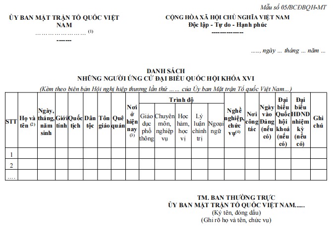 Mẫu danh sách người ứng cử đại biểu Quốc hội khóa XVI