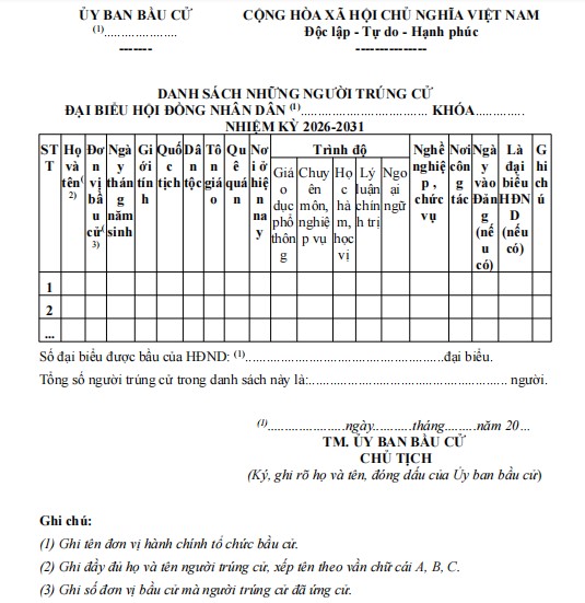 Mẫu danh sách những người trúng cử đại biểu HĐND