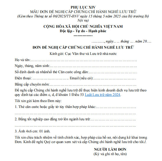 Mẫu đơn đề nghị cấp Chứng chỉ hành nghề lưu trữ mới nhất là mẫu quy định tại Phụ lục 14 ban hành kèm theo Thông tư 06/2025/TT-BNV.