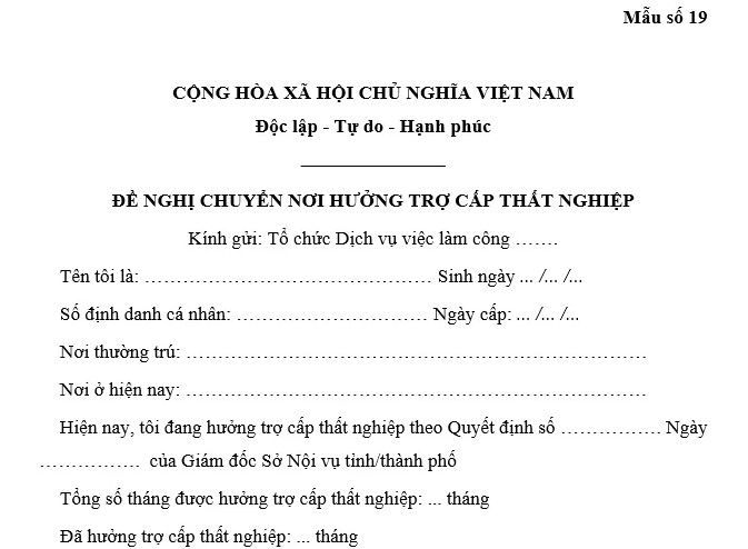Mẫu Đơn đề nghị chuyển nơi hưởng trợ cấp thất nghiệp