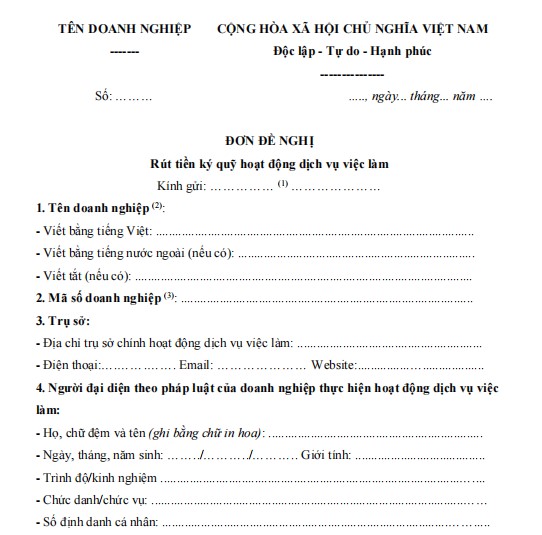 1. Đơn đề nghị rút tiền ký quỹ hoạt động dịch vụ việc làm