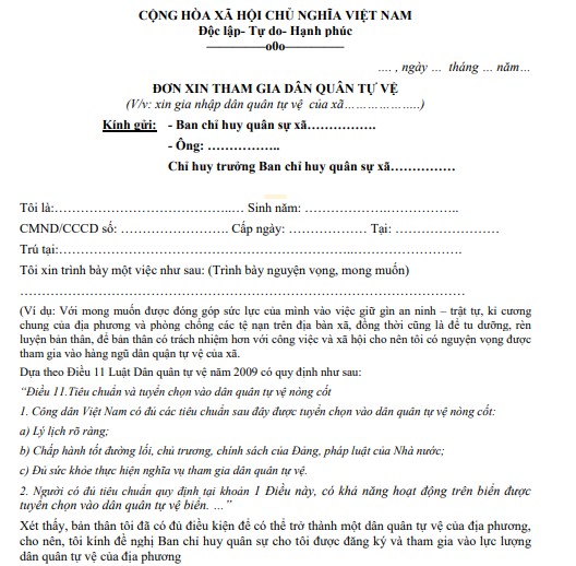 Tôi làm đơn này, kính mong Ban chỉ huy quân sự quận/huyện/phường/xã…..............… xét duyệt cho tôi tham gia lực lượng dân quân tự vệ của địa phương. Tôi xin cam kết sẽ nghiêm chỉnh chấp hành những quy định của pháp luật cũng như của đơn vị trong suốt thời gian luyện tập.