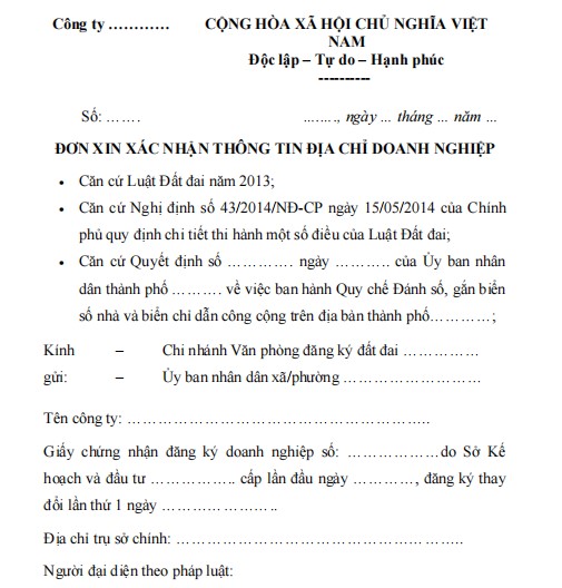 ĐƠN XIN XÁC NHẬN THÔNG TIN ĐỊA CHỈ DOANH NGHIỆP