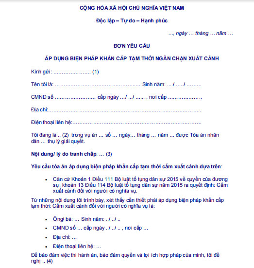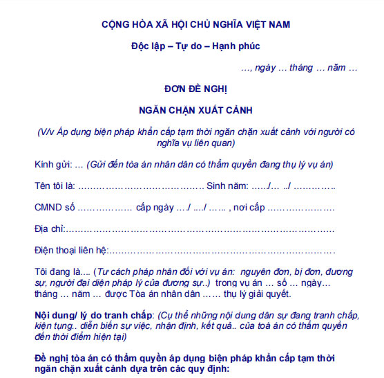 Mẫu đơn yêu cầu ngăn chặn xuất cảnh
