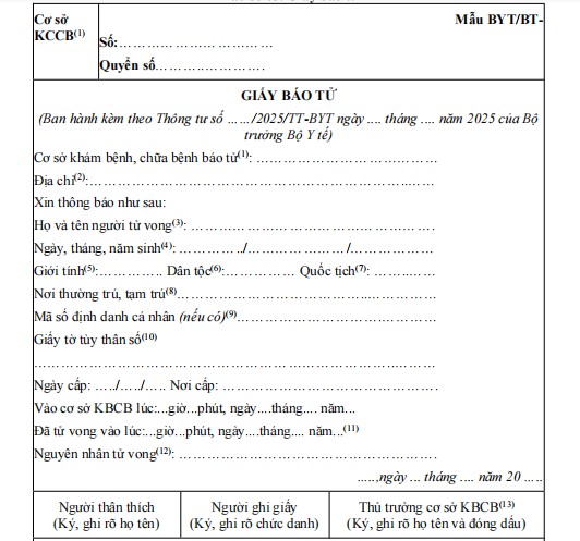 Mẫu giấy báo tử trong lĩnh vực y tế (Mẫu số 05 ban hành kèm theo Thông tư số 25/2025/TT-BYT) là biểu mẫu hành chính quan trọng do cơ sở khám bệnh, chữa bệnh lập để xác nhận thông tin người tử vong theo quy định của pháp luật. Biểu mẫu này được sử dụng làm căn cứ phục vụ công tác đăng ký khai tử, thống kê y tế và quản lý dân cư.