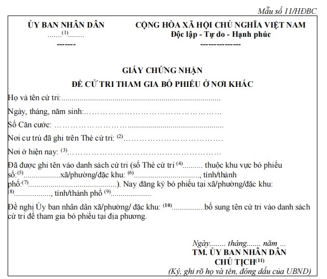 Mẫu giấy chứng nhận để cử tri tham gia bỏ phiếu ở nơi khác (Mẫu số 11/HĐBC) là biểu mẫu hành chính quan trọng, được ban hành kèm theo Phụ lục của Nghị quyết số 40/NQ-HĐBCQG năm 2025.
