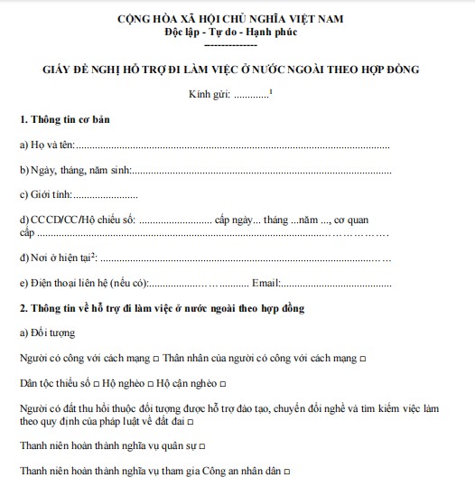 1. Giấy đề nghị hỗ trợ đi làm việc ở nước ngoài theo hợp đồng mới nhất