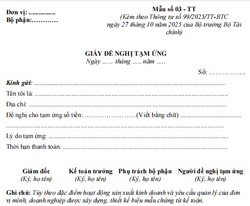 3. Mẫu Giấy đề nghị tạm ứng theo Thông tư 99/2025/TT-BTC mới nhất