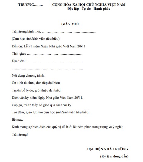 2. Nội dung mẫu giấy mời cựu HSSV dự lễ kỷ niệm ngày Nhà giáo Việt Nam 20-11