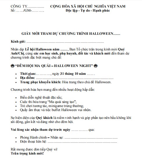 2. Nội dung mẫu giấy mời tham dự chương trình ngày Halloween
