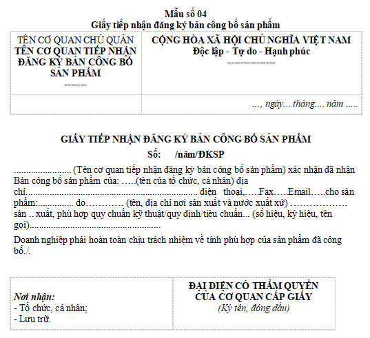Mẫu giấy tiếp nhận đăng ký bản công bố sản phẩm mới nhất theo Nghị định 148