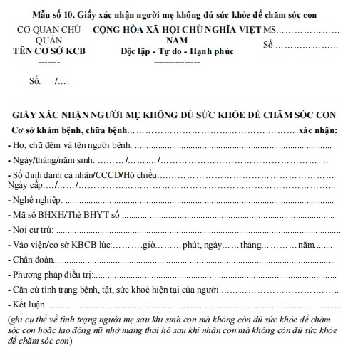 Mẫu số 10. Giấy xác nhận người mẹ không đủ sức khỏe để chăm sóc con