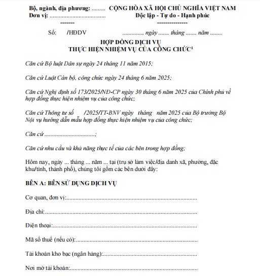 Căn cứ Thông tư số /2025/TT-BNV ngày tháng năm 2025 của Bộ trưởng Bộ Nội vụ hướng dẫn mẫu hợp đồng thực hiện nhiệm vụ của công chức;