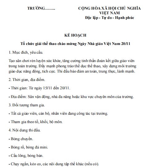 1. Mẫu kế hoạch tổ chức giải thể thao chào mừng ngày Nhà giáo Việt Nam 20/11 dành cho giáo viên tại trường học các cấp