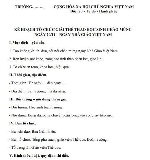 1. Mẫu kế hoạch tổ chức giải thể thao học sinh chào mừng 20/11
