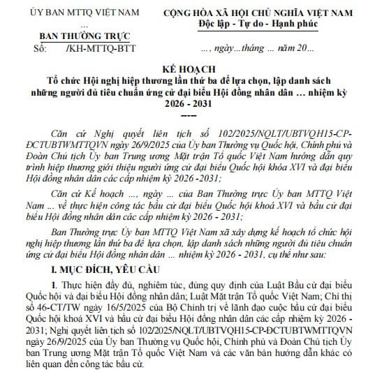 Ban Thường trực Ủy ban MTTQ Việt Nam xã xây dựng kế hoạch tổ chức hội nghị hiệp thương lần thứ ba để lựa chọn, lập danh sách những người đủ tiêu chuẩn ứng cử đại biểu Hội đồng nhân dân … nhiệm kỳ 2026 - 2031, cụ thể như sau:
