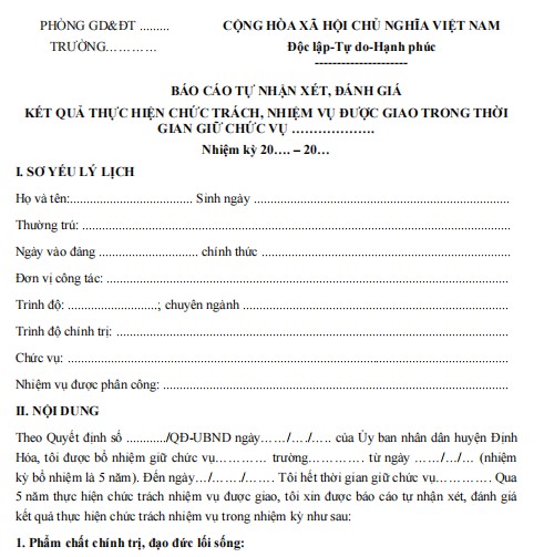 Theo Quyết định số ............/QĐ-UBND ngày……/…./….. của Ủy ban nhân dân huyện Định Hóa, tôi được bổ nhiệm giữ chức vụ………… trường…………. từ ngày ……/…/… (nhiệm kỳ bổ nhiệm là 5 năm). Đến ngày…/……./……. Tôi hết thời gian giữ chức vụ…………. Qua 5 năm thực hiện chức trách nhiệm vụ được giao, tôi xin được báo cáo tự nhận xét, đánh giá kết quả thực hiện chức trách nhiệm vụ trong nhiệm kỳ như sau: