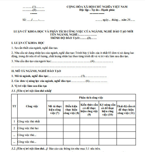 Việc xây dựng và ban hành ngành, nghề đào tạo mới trong hệ thống giáo dục nghề nghiệp và giáo dục đại học đòi hỏi phải có cơ sở lý luận và thực tiễn chặt chẽ. Trong đó, mẫu luận cứ khoa học và phân tích công việc là tài liệu quan trọng, thể hiện rõ sự cần thiết, tính phù hợp, và triển vọng của ngành nghề được đề xuất.