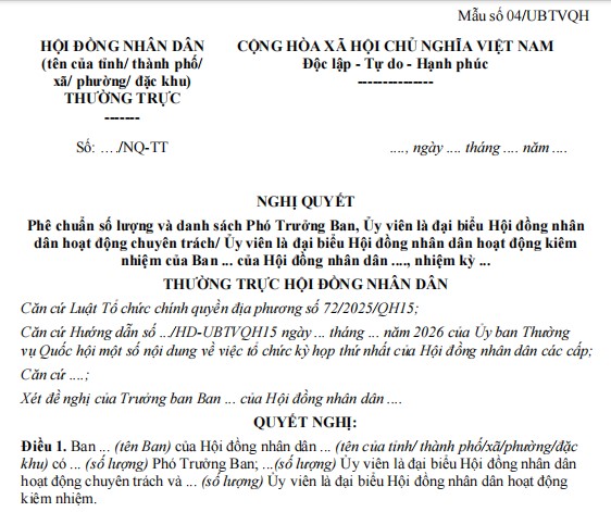 Điều 1. Ban ... (tên Ban) của Hội đồng nhân dân ... (tên của tỉnh/ thành phố/xã/phường/đặc khu) có ... (số lượng) Phó Trưởng Ban; ...(số lượng) Ủy viên là đại biểu Hội đồng nhân dân hoạt động chuyên trách và ... (số lượng) Ủy viên là đại biểu Hội đồng nhân dân hoạt động kiêm nhiệm.