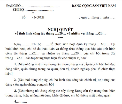Lưu ý: Nghị quyết cần phân công cụ thể cá nhân, tập thể thực hiện các nhiệm vụ trọng tâm trong tháng mà chi bộ đã thông qua.