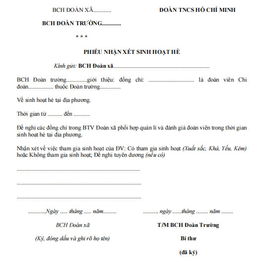 3 mẫu phiếu nhận xét sinh hoạt hè