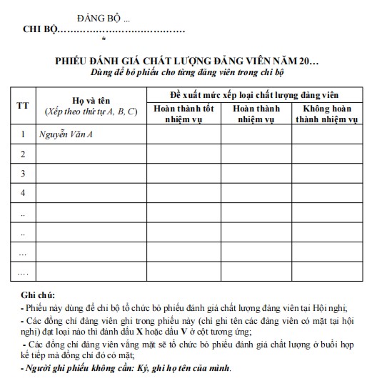 - Phiếu này dùng để chi bộ tổ chức bỏ phiếu đánh giá chất lượng đảng viên tại Hội nghị;