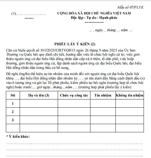 Mẫu phiếu lấy ý kiến đối với người ứng cử đại biểu Quốc hội (Mẫu số 07/PLYK) được ban hành kèm theo Phụ lục của Nghị quyết 101/2025/UBTVQH15 là biểu mẫu hành chính quan trọng, sử dụng trong quy trình hiệp thương, lấy ý kiến cử tri nơi cư trú và nơi công tác đối với người được giới thiệu ứng cử. Biểu mẫu này nhằm ghi nhận trung thực, khách quan ý kiến nhận xét, đánh giá của cử tri về phẩm chất chính trị, đạo đức, lối sống, năng lực công tác và uy tín xã hội của người ứng cử.