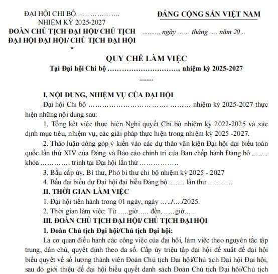 Mẫu Quy chế đại hội chi bộ sau sáp nhập là văn bản hành chính quan trọng, giúp các tổ chức cơ sở đảng có căn cứ thực hiện đầy đủ các bước chuẩn bị, tiến hành và tổng kết đại hội. Quy chế này quy định cụ thể về nguyên tắc, trình tự, thủ tục, quyền và trách nhiệm của các thành viên tham dự, đồng thời bảo đảm sự lãnh đạo tập trung, dân chủ trong quá trình tổ chức. Việc ban hành và áp dụng mẫu quy chế sẽ góp phần nâng cao chất lượng hoạt động của chi bộ, tạo nền tảng vững chắc cho công tác xây dựng Đảng ở cơ sở trong giai đoạn mới, mời các bạn cùng tham khảo và tải về sử dụng.