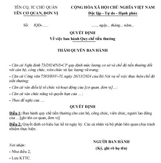 - Căn cứ Công văn 7585/BNV-TL ngày 26/11/2024 của Bộ Nội vụ về việc thực hiện chế độ tiền thưởng;