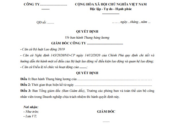 Với mong muốn hỗ trợ quý doanh nghiệp hoàn thiện bộ hồ sơ pháp lý một cách nhanh chóng và chính xác nhất, Hoatieu.vn xin chia sẻ mẫu quyết định ban hành hệ thống thang bảng lương được cập nhật mới nhất theo quy định hiện hành, mời quý bạn đọc cùng tham khảo chi tiết và tải về sử dụng ngay tại đây để kiện toàn hệ thống lương thưởng của đơn vị mình.