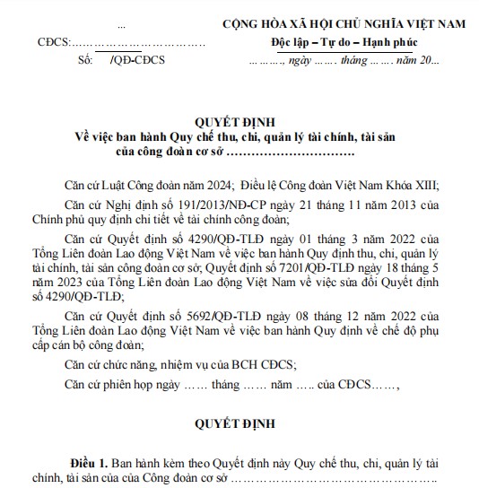 1. Biểu mẫu quyết định ban hành Quy chế thu, chi, quản lý tài chính công đoàn cơ sở