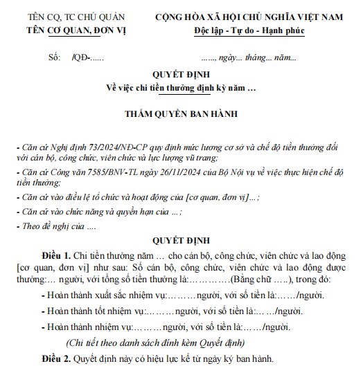 Mẫu Quyết định chi tiền thưởng định kỳ theo Nghị định 73/2024/NĐ-CP là văn bản hành chính được ban hành nhằm cụ thể hóa việc thực hiện chế độ tiền thưởng đối với cán bộ, công chức, viên chức và người lao động trong cơ quan, đơn vị. Quyết định này được lập trên cơ sở kết quả đánh giá mức độ hoàn thành nhiệm vụ, quy chế chi tiêu nội bộ và nguồn kinh phí được cấp có thẩm quyền phê duyệt, bảo đảm đúng đối tượng, đúng tiêu chí và đúng mức thưởng theo quy định của pháp luật.