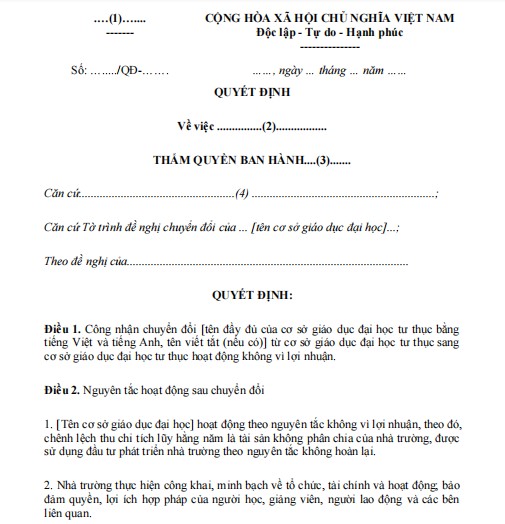 Mẫu Quyết định chuyển đổi cơ sở giáo dục đại học tư thục sang mô hình không vì lợi nhuận