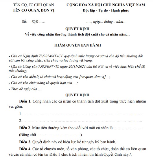 Biểu mẫu Quyết định công nhận thành tích đột xuất cho cá nhân được ban hành theo quy định tại Nghị định 73/2024/NĐ-CP của Chính phủ về khen thưởng thành tích đột xuất trong thực hiện nhiệm vụ, nhằm ghi nhận, biểu dương kịp thời những cá nhân có đóng góp bất ngờ, vượt trội so với yêu cầu công việc thông thường, góp phần hoàn thành xuất sắc nhiệm vụ chính trị, kinh tế - xã hội hoặc bảo vệ Tổ quốc.