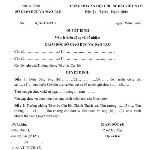 Điều 1. Điều động ông (bà)..............(2)............., ......(3).......... đến nhận công tác tại .......(4).....trực thuộc Sở Giáo dục và Đào tạo và bổ nhiệm giữ chức vụ.......(5).......;
