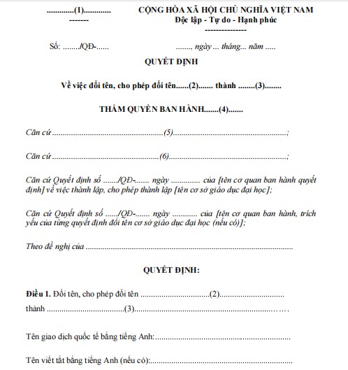 1. Biểu mẫu Quyết định đổi tên, cho phép đổi tên cơ sở giáo dục đại học