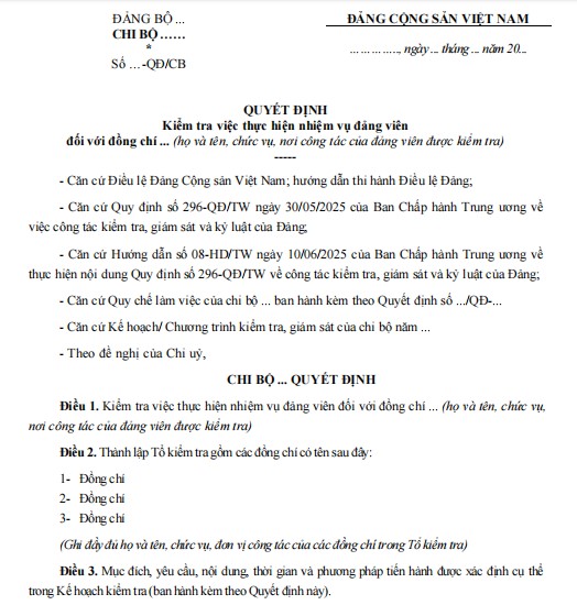 Mẫu Quyết định kiểm tra việc thực hiện nhiệm vụ đảng viên của chi bộ sau sáp nhập là văn bản hành chính quan trọng, nhằm đảm bảo tính thống nhất trong công tác quản lý, giám sát và đánh giá chất lượng hoạt động của đảng viên. Sau khi chi bộ được sáp nhập, việc kiểm tra, giám sát càng có ý nghĩa thiết thực để kịp thời phát hiện những điểm mạnh, hạn chế, từ đó đưa ra giải pháp nâng cao hiệu quả công tác xây dựng Đảng.