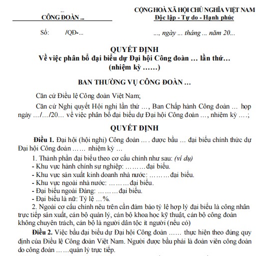 Mẫu Quyết định phân bổ đại biểu dự Đại hội công đoàn