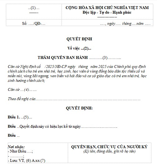 Nội dung mẫu quyết định thường thể hiện rõ: căn cứ pháp lý, phạm vi áp dụng, danh sách người học được hưởng chính sách, mức hỗ trợ, trách nhiệm thực hiện và hiệu lực thi hành. Việc áp dụng đúng biểu mẫu theo Nghị định 66/2025/NĐ-CP góp phần tăng cường công khai, minh bạch, nâng cao hiệu quả quản lý tài chính, trợ cấp, đồng thời thể hiện sự quan tâm của Nhà nước đối với công tác giáo dục, đặc biệt là vùng sâu, vùng xa và khu vực còn nhiều khó khăn. Đây cũng là tài liệu tham khảo tin cậy phục vụ công tác ban hành quyết định tại các cơ sở giáo dục, cơ quan chuyên môn và đơn vị quản lý trên địa bàn, mời các bạn cùng tham khảo.